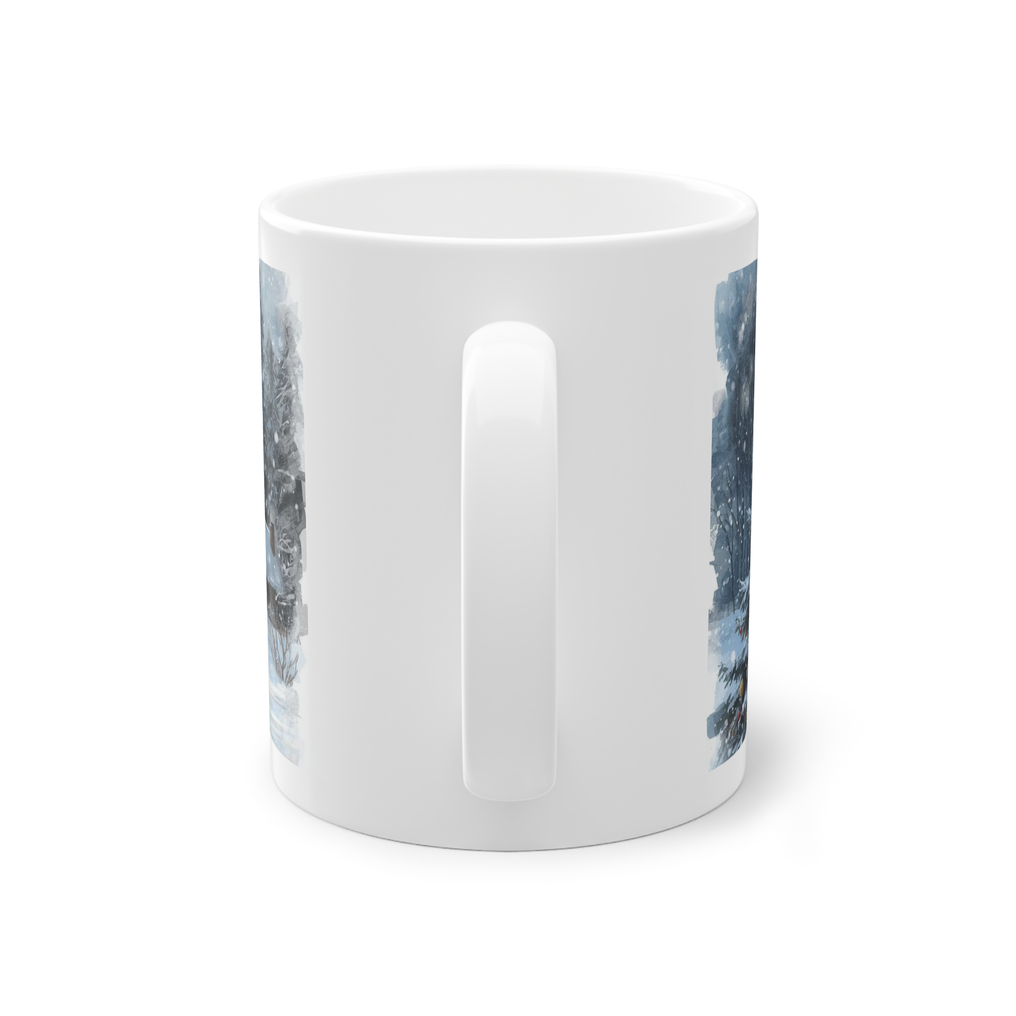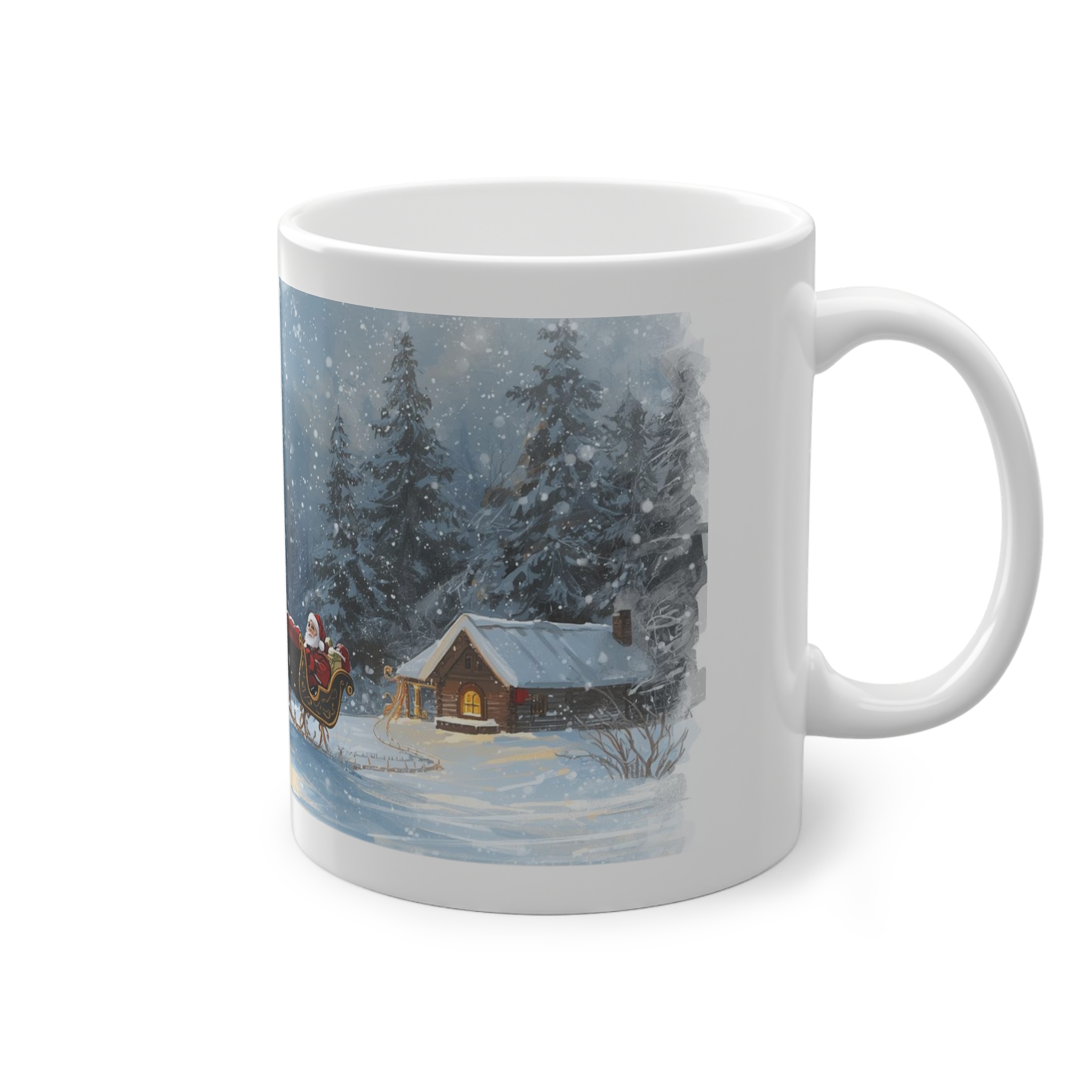 Diese glänzende 11oz-Keramiktasse hält nicht nur dein Getränk warm, sondern auch deine Stimmung. Ein sanftes Wintermotiv legt sich wie eine kleine Geschichte um die Tasse: ein funkelnder Weihnachtsbaum voller Kugeln, dahinter eine dämmernde Waldszene, und ein Schlitten, der auf einem schneebedeckten Pfad ruht.