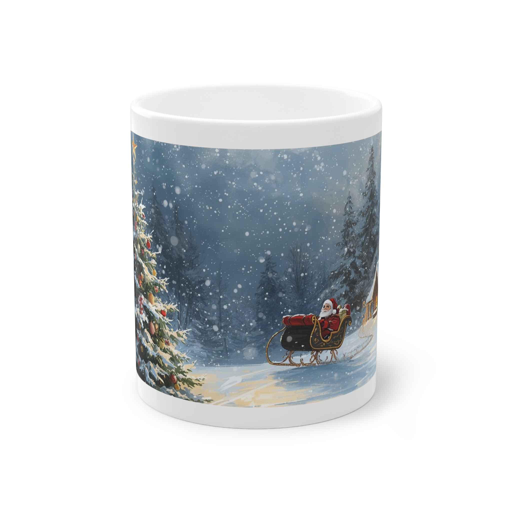 ❄️ Keramiktasse mit verschneitem Weihnachtsbaum und Weihnachtsmannschlitten – Wärme für ruhige Wintermorgen